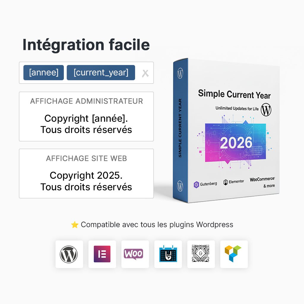Le plugin affiche automatiquement l’année en cours sur votre site WordPress, idéal pour les copyrights, mentions légales ou tout contenu dynamique qui doit rester à jour.